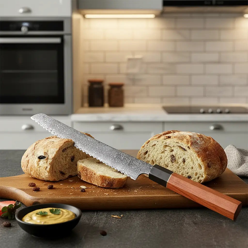 Sa lame dentée, trempée à une dureté Rockwell de 60-61 HRC, découpe avec précision même les croûtes les plus épaisses sans écraser la mie. Un tranchant redoutable, stable et durable. Chaque lame est polie à la main selon la méthode Hamaguri-ba, garantissant un tranchant rasoir.