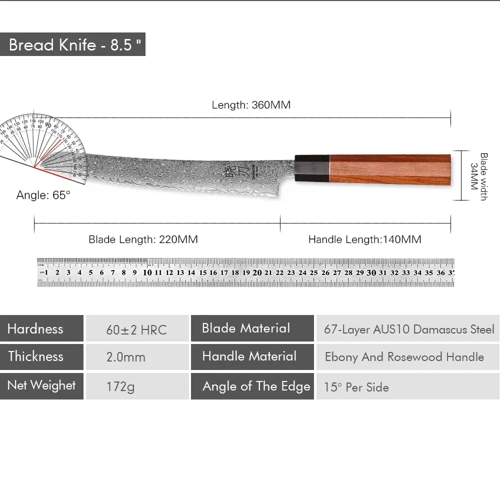 Ce couteau à pain japonais allie la puissance du VG10 damassé 67 couches à la finesse du savoir-faire artisanal nippon. Sa lame dentée, trempée à une dureté Rockwell de 60-61 HRC, découpe avec précision même les croûtes les plus épaisses sans écraser la mie. Un tranchant redoutable, stable et durable. Chaque lame est polie à la main selon la méthode Hamaguri-ba, garantissant un tranchant rasoir.