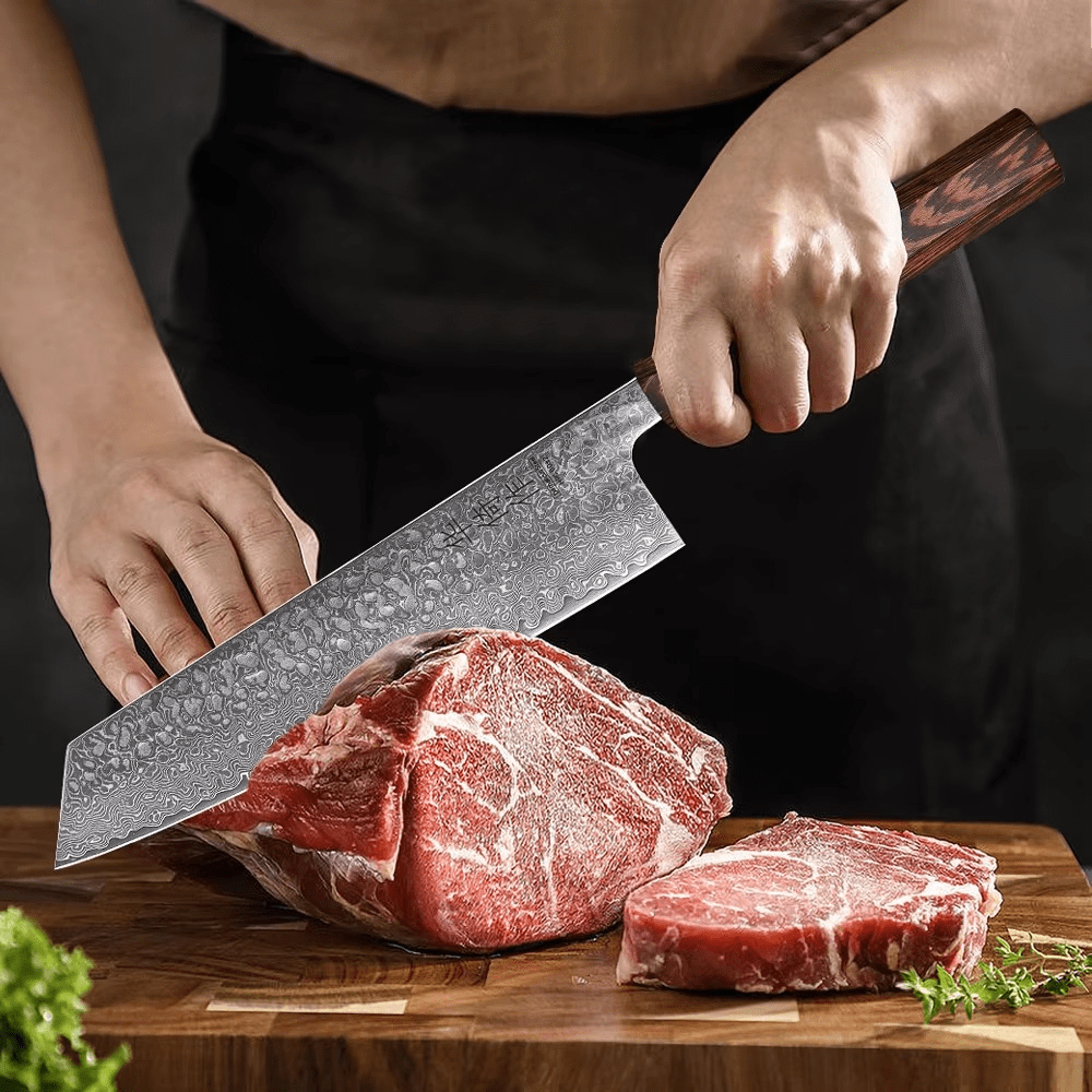 La lame des couteaux Muramasi Japan® est taillée dans un acier Damas 90Cr18MoV à 67 couches et combine la beauté ondulée du damas avec une dureté Rockwell de 60-61 HRC, pour un tranchant rasoir, stable, affûté, conçu pour les coupes longues, nettes et millimétrées.