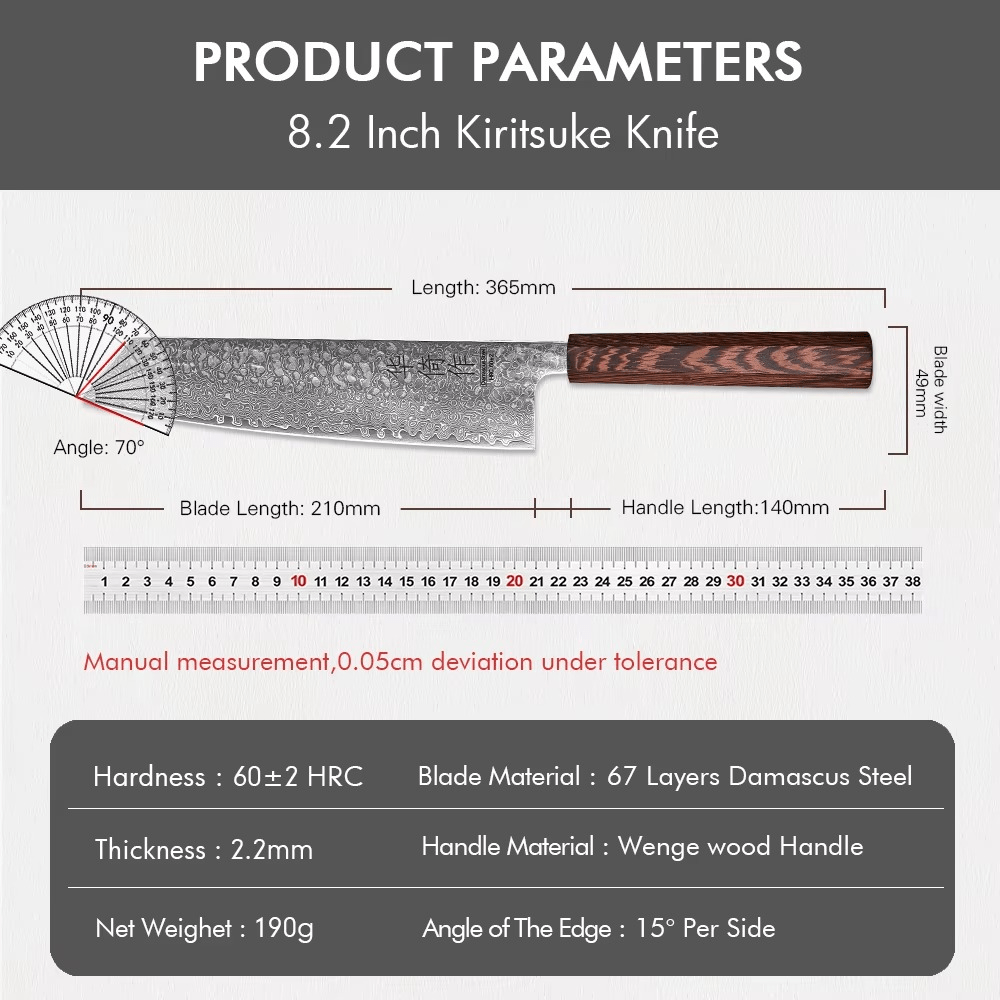 Forgé selon un procédé complexe, chaque lame est composée de 67 couches superposées autour d’un noyau en acier VG-10 japonais, reconnu dans le monde entier pour sa dureté exceptionnelle (60 ± 2 HRC), son tranchant chirurgical et sa résistance à l’usure.