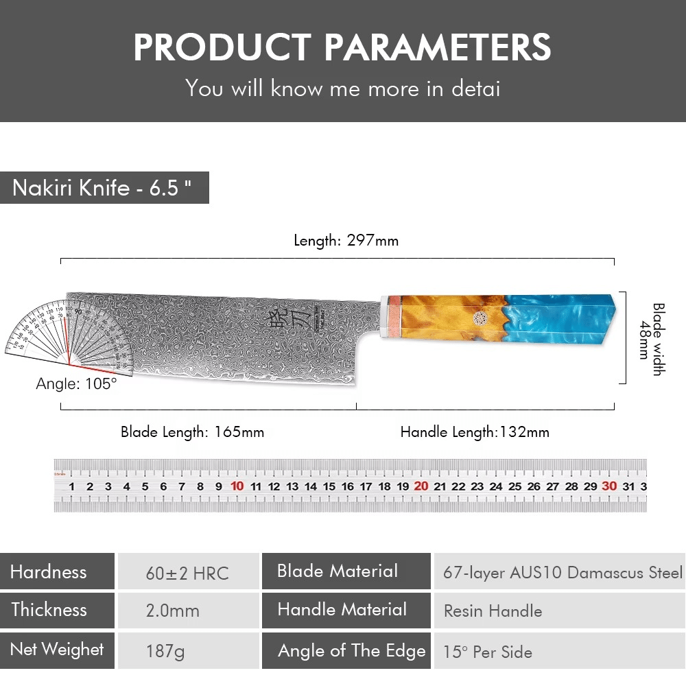 Avec sa lame d'exception composée de 67 couches d'acier Damas, ce Nakiri offre une précision de coupe inégalée et une robustesse qui surpasse toutes les attentes. Chaque tranche et chaque découpe se fait en douceur, transformant la préparation de légumes en un geste précis et rapide.
