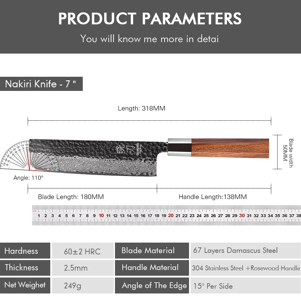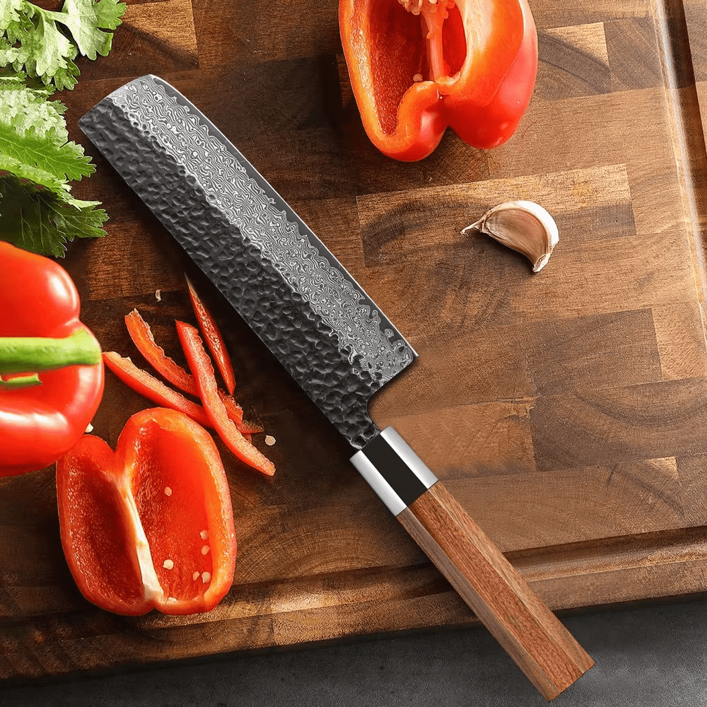 Couteau japonais Nakiri forgé à la main en acier Damas - Manche en bois de rose et acier inoxydable