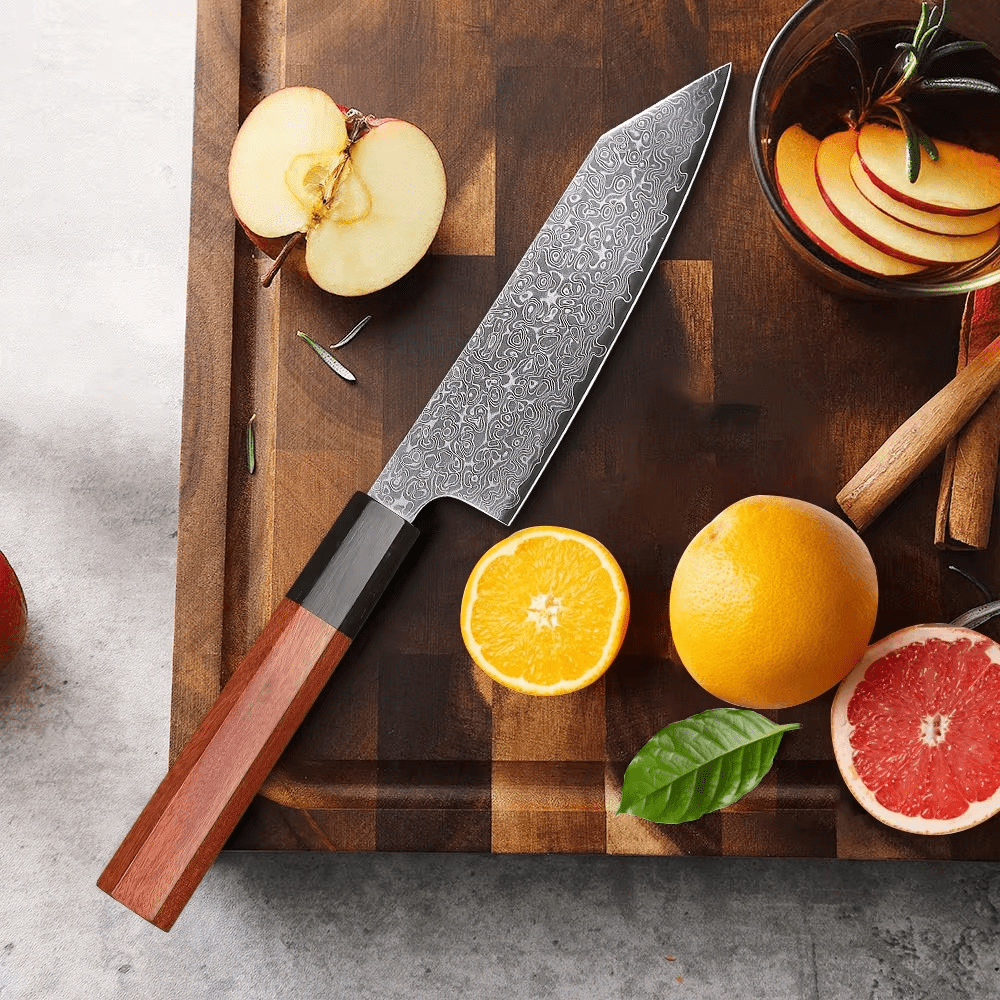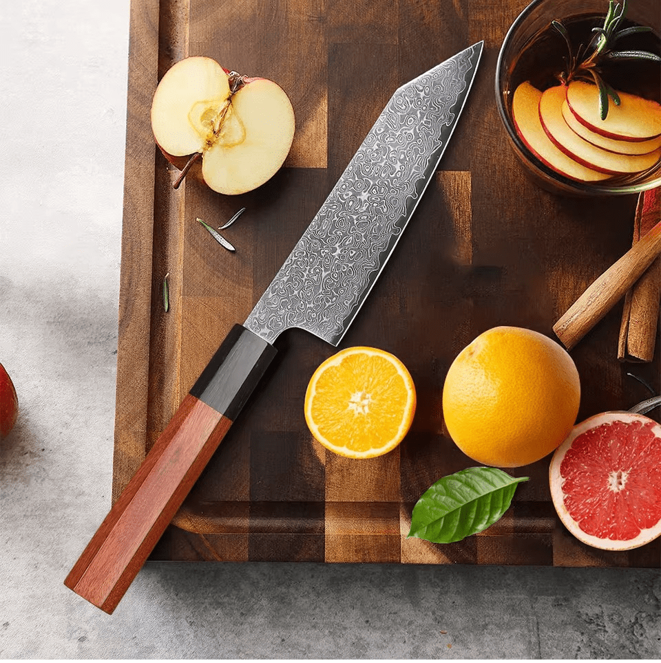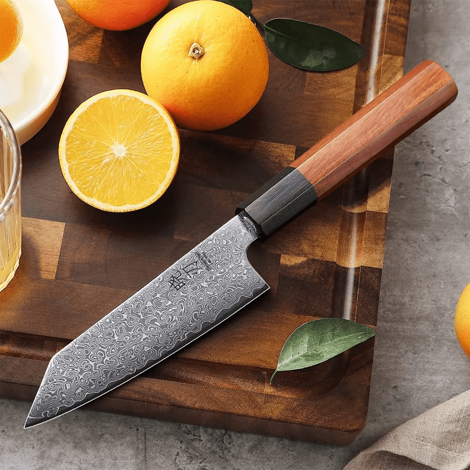 Compact mais redoutable, le Petty japonais est l’allié indispensable pour les gestes minutieux :éplucher, tailler, ciseler avec une agilité chirurgicale. Sa lame en acier Damas AUS10, forgée à la main, révèle 67 couches aux motifs fluides, preuve d’un travail artisanal d’exception. Avec une dureté Rockwell de 60-61 HRC, il offre un tranchant ultra-fin, durable, toujours prêt à répondre aux exigences des chefs les plus méticuleux.