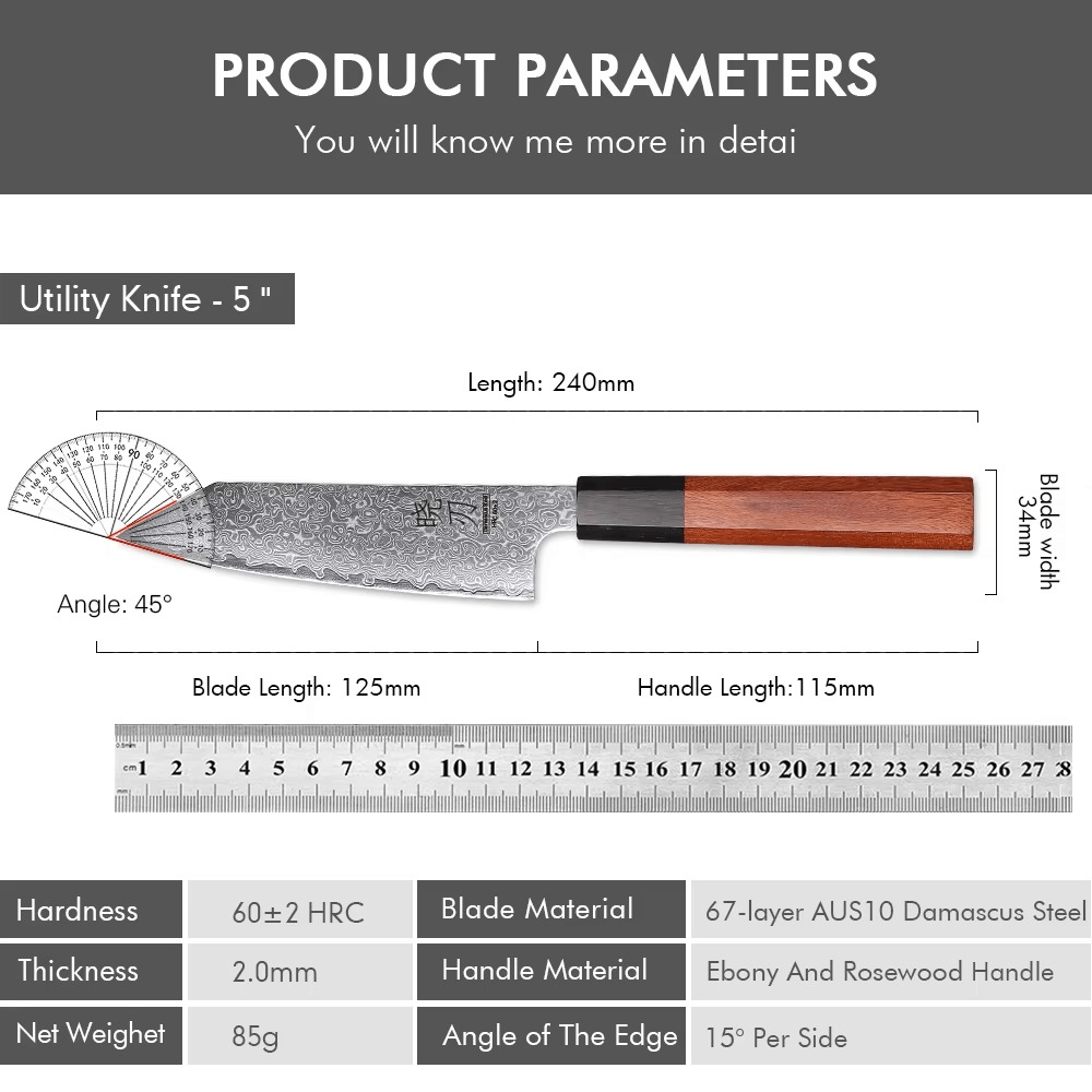 Le manche en bois de rose et ébène poli, au grain naturel raffiné, assure une prise en main ergonomique et parfaitement équilibrée. Ce couteau japonais est idéal pour les professionnels comme pour les amateurs exigeants.