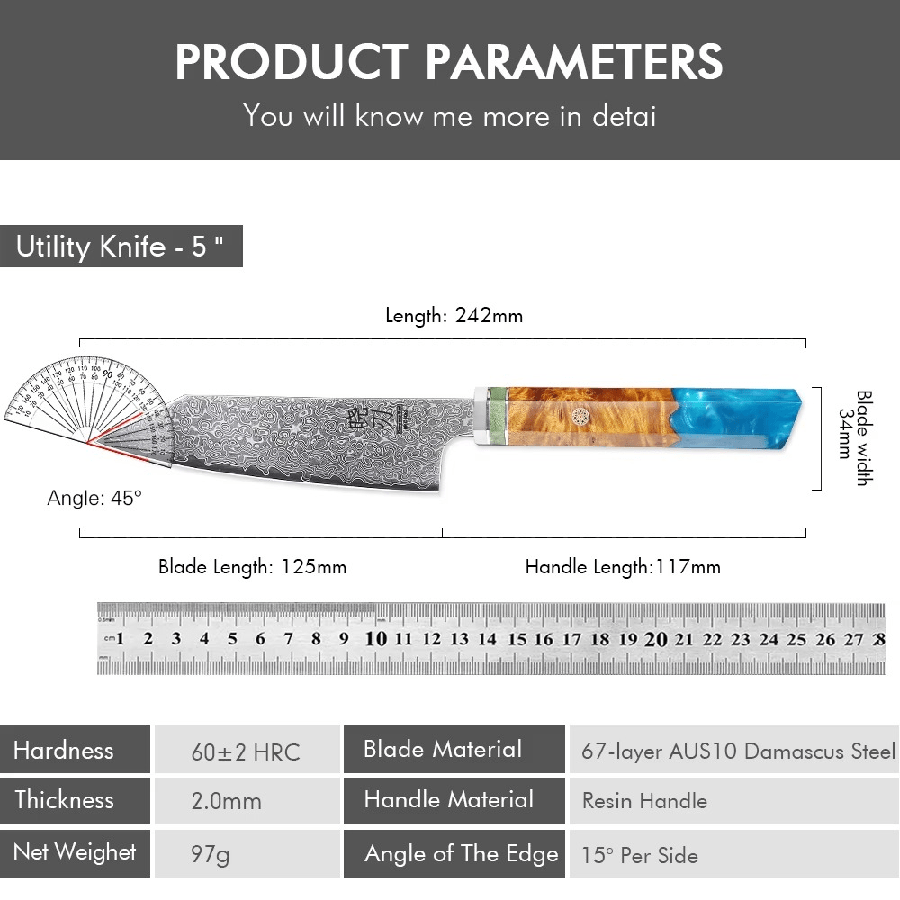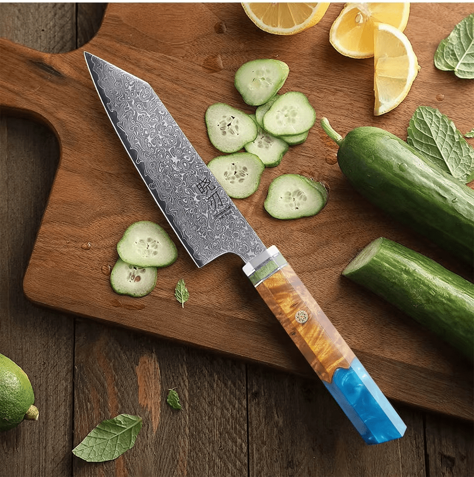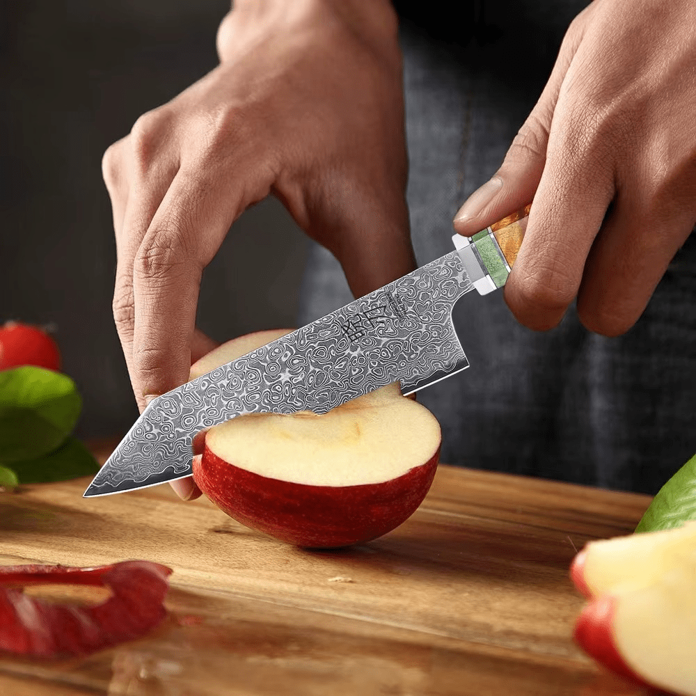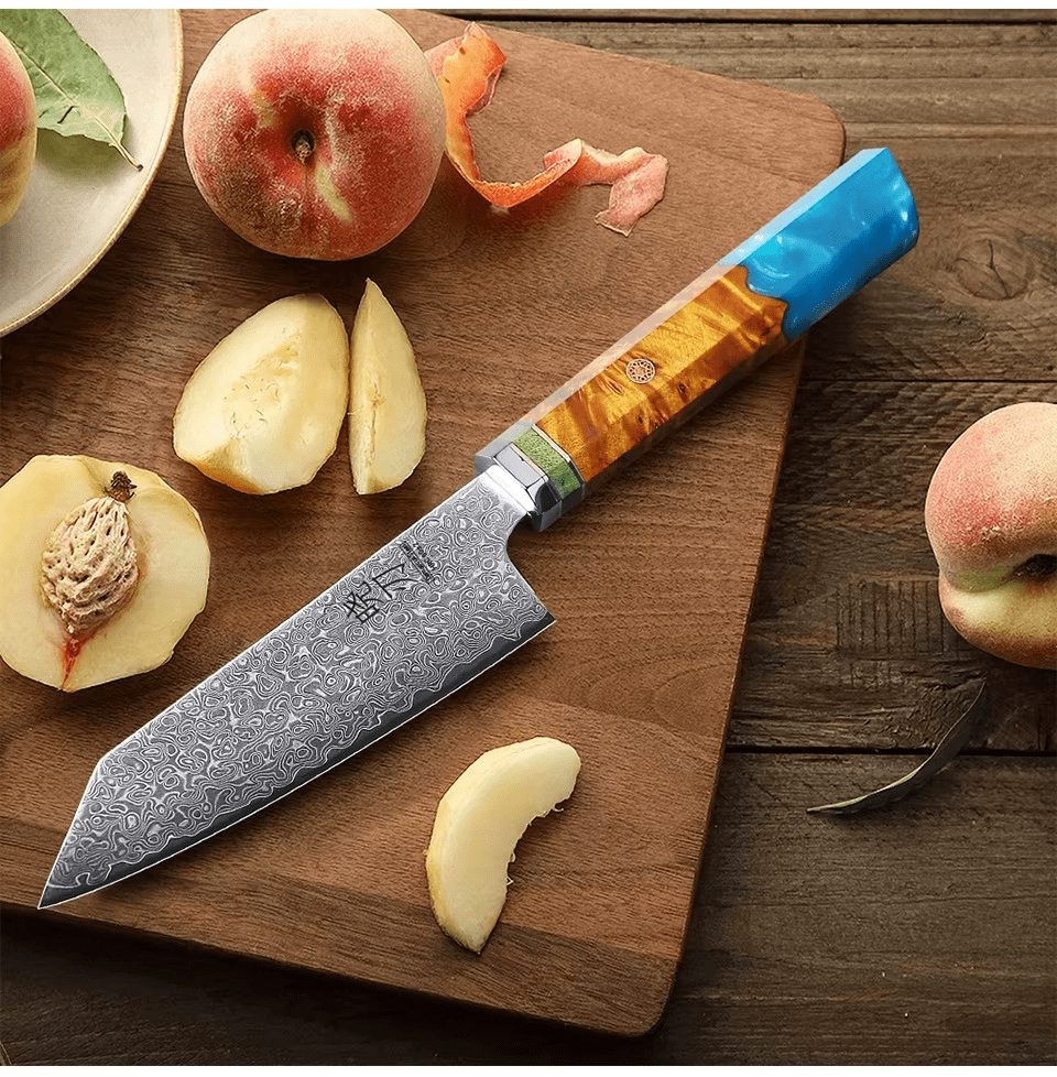Compact mais redoutable, le Petty japonais est l’allié indispensable pour les gestes minutieux : éplucher, tailler, ciseler avec une agilité chirurgicale. Sa lame en acier Damas 90Cr18MoV, forgée à la main, révèle 67 couches aux motifs fluides, preuve d’un travail artisanal d’exception. Avec une dureté Rockwell de 60-61 HRC, il offre un tranchant ultra-fin, durable, toujours prêt à répondre aux exigences des chefs les plus méticuleux.