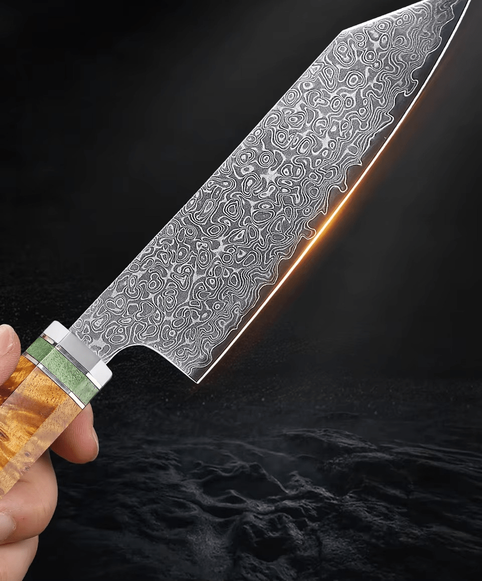 La lame des couteaux Muramasi Japan® est taillée dans un acier Damas 90Cr18MoV à 67 couches et combine la beauté ondulée du damas avec une dureté Rockwell de 60-61 HRC, pour un tranchant rasoir, stable, affûté, conçu pour les coupes longues, nettes et millimétrées.